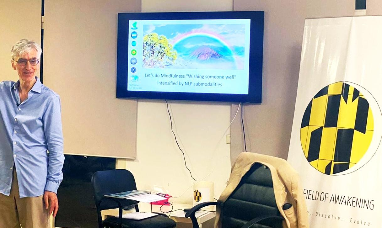 •This is about mindfulness reconnection with this part inside you. When you know NLP, you can take a vibration, a sound, a feeling, a light and then you approach that part and from that moment on, you are never alone! Karl trains "Mindfulness Teacher, In-Me" without NLP and "Mindfulness Trainer, In-Me" with NLP. “NLP-Mindfulness” is very challenging. We understand our growth even better, to take a big step into NLP-Mindfulness and a new form of expertise. There is so much in NLP that we can offer in mindfulness – there are many doors open. NLP and Mindfulness often have the same goals: