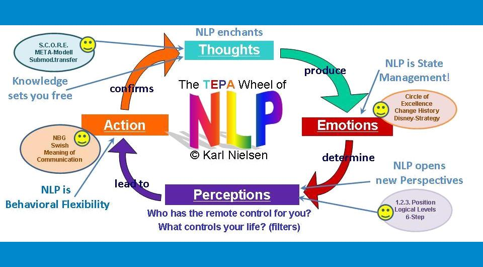 The power and potential of NLP comes from modelling the communication competency of highly successful people and from effective knowledge of Neuro Science, Linguistic and Psychology. The above “TEPA Wheel of NLP” shows exemplary for each of these 4 areas a few typical NLP interventions that can easily be used for working with problems in this area. You can for example use the NLP interventions from the “Meta Model” to detect and change limiting beliefs (Thoughts), the “Circle of Excellence” to stabilize your emotional state (Emotions), the “1.2.3. Position” to change your point of view (Perception) and the “New Behavior Generator” to mentally practice future wanted performance (Action). The 12 NLP interventions in this graphic (marked with a smily) are part of the normal basic NLP training: “NLP Practitioner, IN”. TEPA means: Thoughts (believes) produce Emotions (feelings) that determine Perceptional filter that lead to Action that confirm Thoughts… This is a kind of wheel that can establish a success loop of joyful inner communication as well as a negative vicious circle with tremendous consequences for all the actions taken on these grounds.